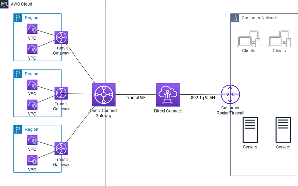 VPC의 관리를 위해 Transit Gateway를 쓰던 환경이었다면 Direct Connect Gateway를 통해 이를 연결할 수 있습니다.