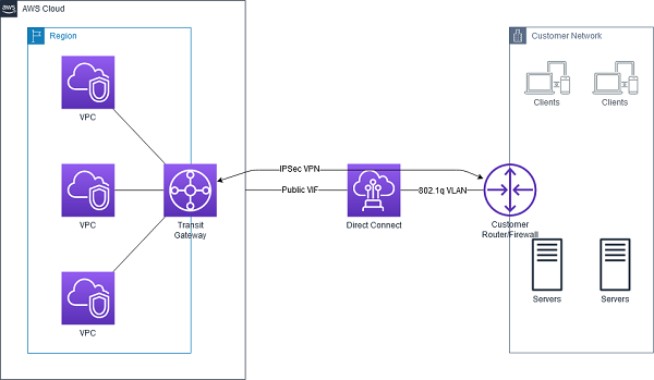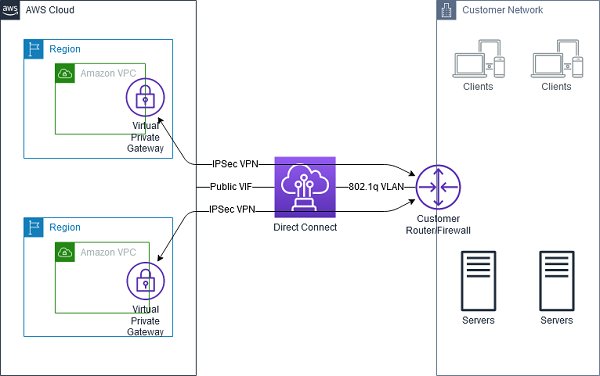이러한 구성으로 종단간 보안 IPSec 연결의 장점과 Direct Connect의 대역폭을 결합하여 일반 회선을 사용하는 것 보다 향상된 네트워크 경험을 제공합니다.