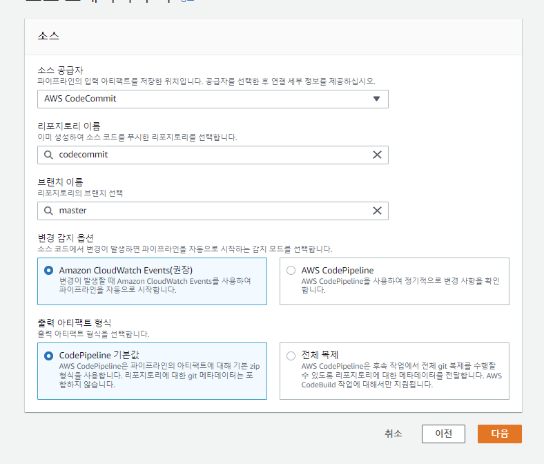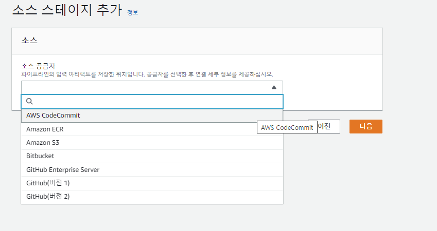 먼저 소스 공급자를 선택해야 한다. 다양한 공급자가 존재하지만 우리는 CodeCommit을 통해서 소스를 공급했기 때문에 CodeCommit을 선택한다.