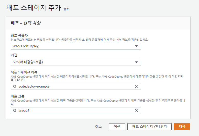 CodeDeploy를 선택한 이후 내 애플리케이션과 배포 그룹을 선택하고 다음을 눌러준다. 마지막은 검토이므로 그냥 생성을 완료하면 된다.