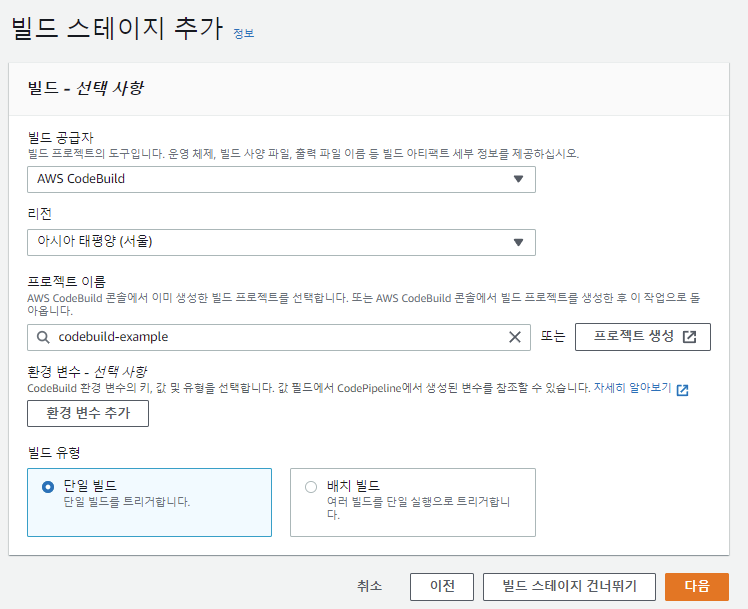 CodeBuild를 선택한 이후 내가 생성했던 프로젝트를 선택한다. 그 다음 나는 빌드를 하나만 생성했기 때문에 단일 빌드를 클릭한 후 다음을 눌러준다.
