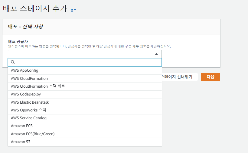 배포 스테이지 역시 다양하게 존재한다. 그 중 우리는 CodeDeploy를 이용했기 때문에 CodeDeploy를 선택한다.