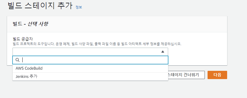 우리는 AWS CodeBuild를 통해 빌드를 진행했기 때문에 AWS CodeBuild를 선택한다.
