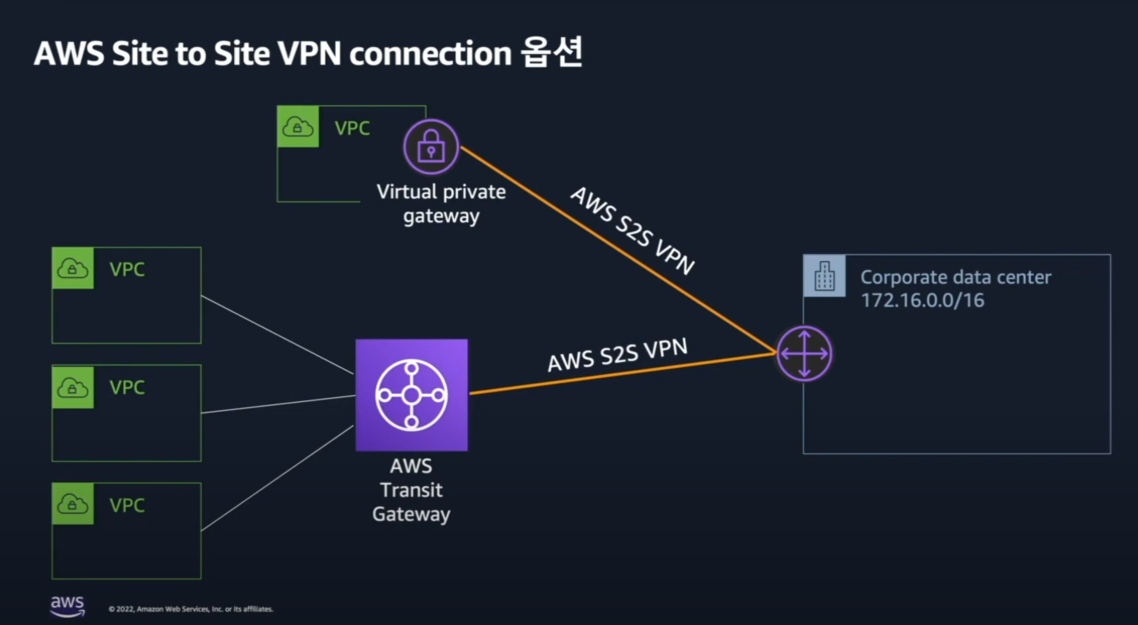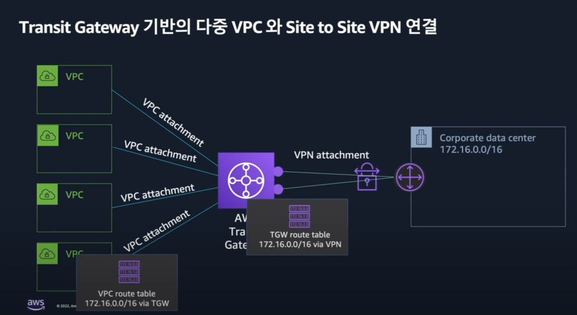 여러 VPC와 연결하기 위해서는 고객측의 Gateway와 Transit Gateway와 연결하여 VPC 연결을 통합하고 VPC Route table에서는 온프레미스 주소를 TGW로 라우팅 되도록 설정하고 TGW에서는 다시 VPN으로 전달 되도록 설정한다.