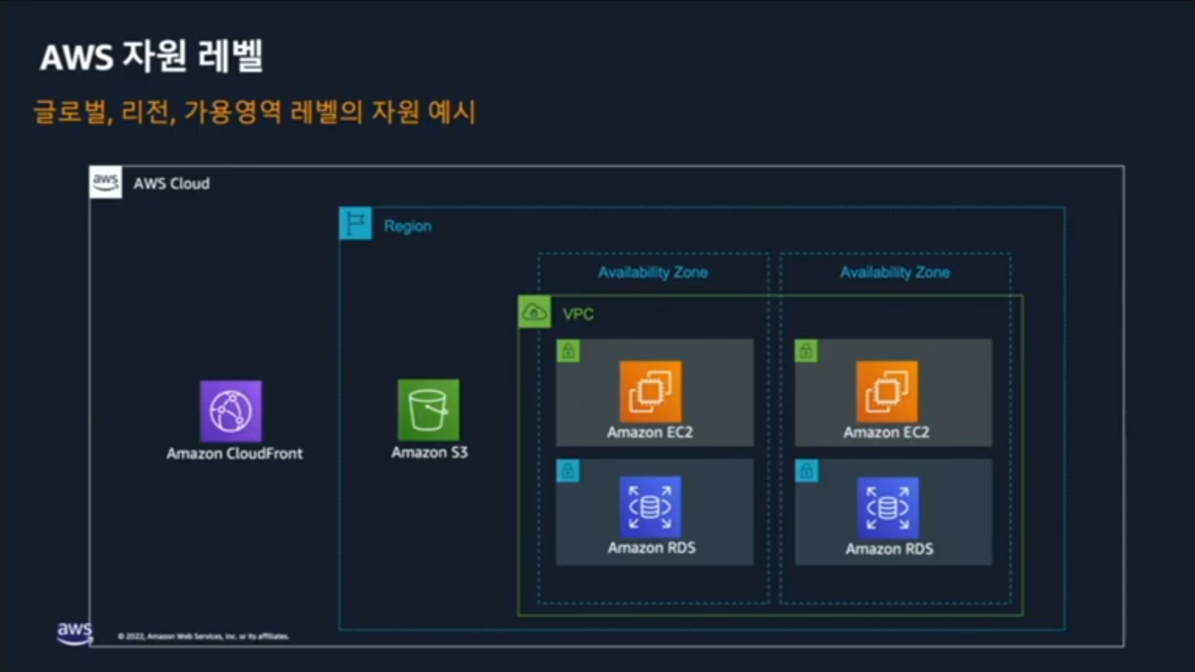 AWS 자원 레벨로는 AWS Cloud내에 Region이 있고 그 아래에 VPC등의 구조로 되어 있다.