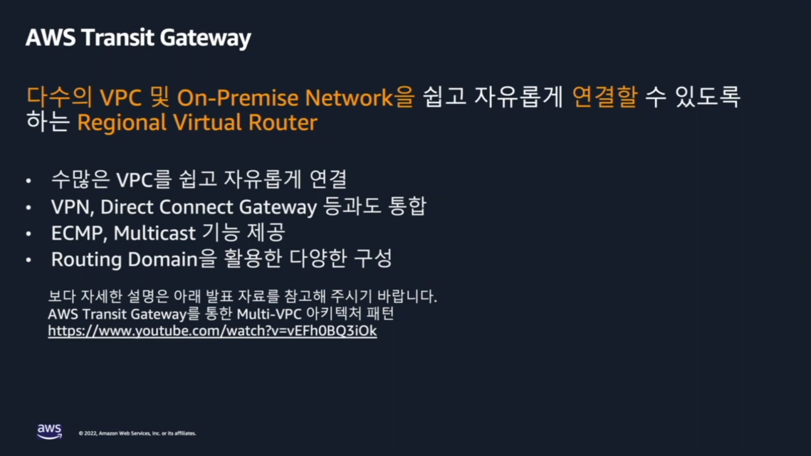 Transit Gateway 기반의 Region 단위 가상 Router로 연결하는 방법이 있다.
