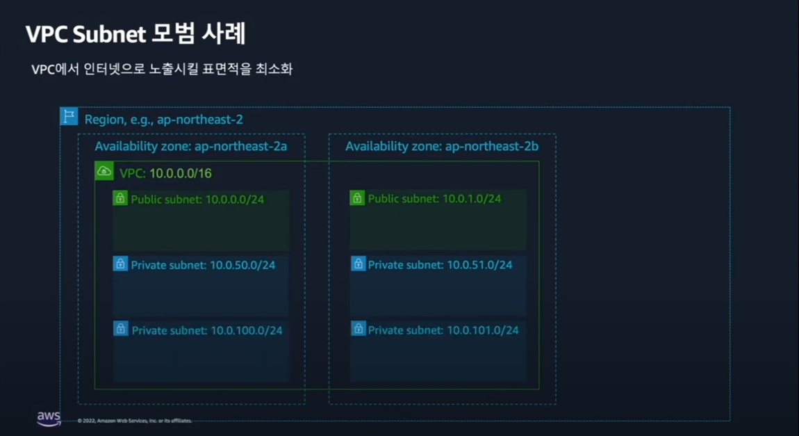 VPC Subnet의 모범사례이다. VPC에서 인터넷으로 노출시킬 서버를 최소화하여 보안을 강화한다.