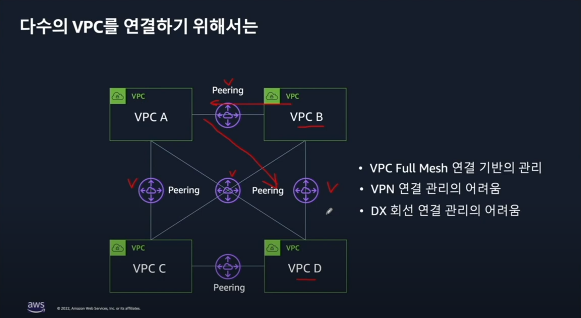 그렇기 때문에 Transit Gateway를 적용하여 간소하게 관리를 할수 있다.