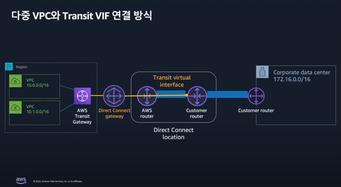 Transit Virtual Interface로 구성된 Direct Connect Gateway를 Transit Gateway와 연결하고 여기에 모든 VPC를 연결하면 Region 기준의 중앙화된 Router가 만들어진다. Transit Gateway에 VPC가 추가되는 경우에도 온프레미스와 AWS에는 추가적인 설정 없이도 변경되는 모든 네트워크 구성이 즉시 반영되게 된다.