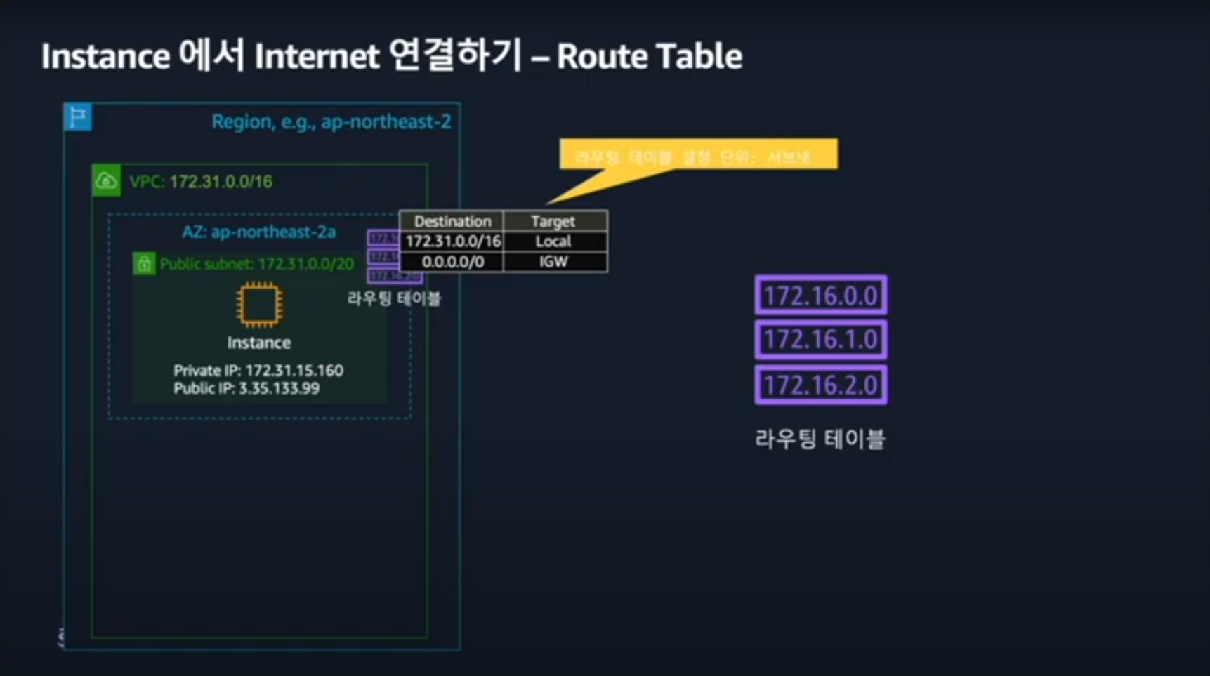 Routing Table에 인터넷 게이트웨이를 등록해서 인터넷과 통신이 가능하게끔 구성한다.