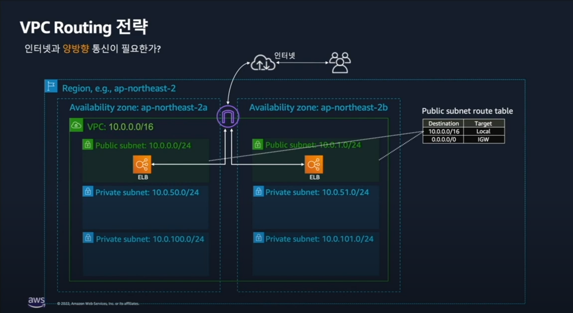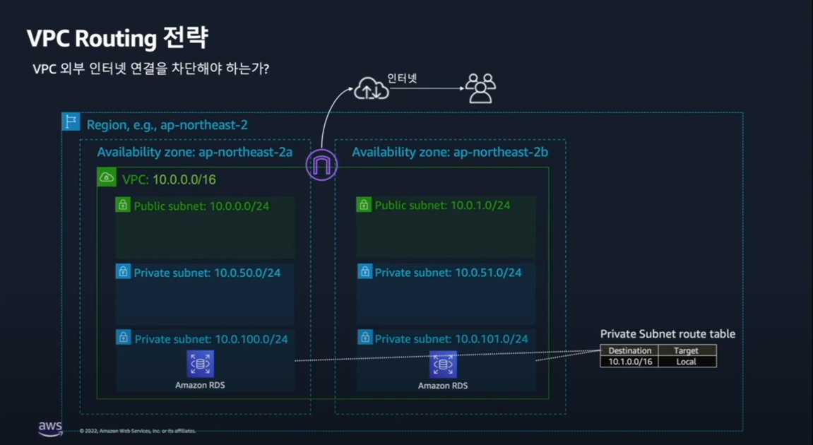 RDS등 인터넷과 통신이 전혀 연관 없는 Instance들 같은 경우에는 VPC 내부 IP 대역만 설정된 라우팅 테이블을 구성한다.