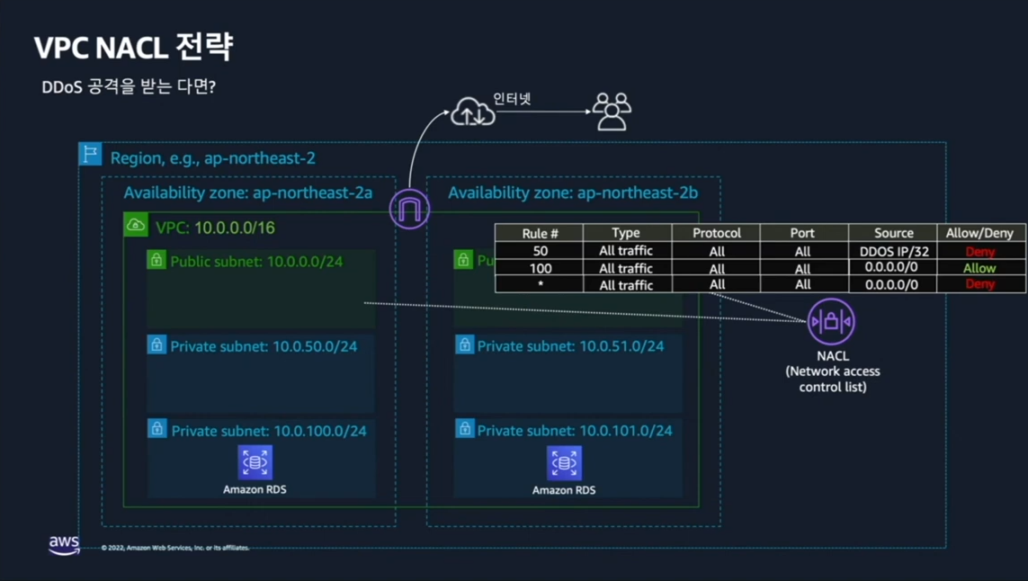 NACL을 통해서 외부 공격을 Deny 하고, 허용되는 트래픽만 Allow 하는 방식으로 설정한다.