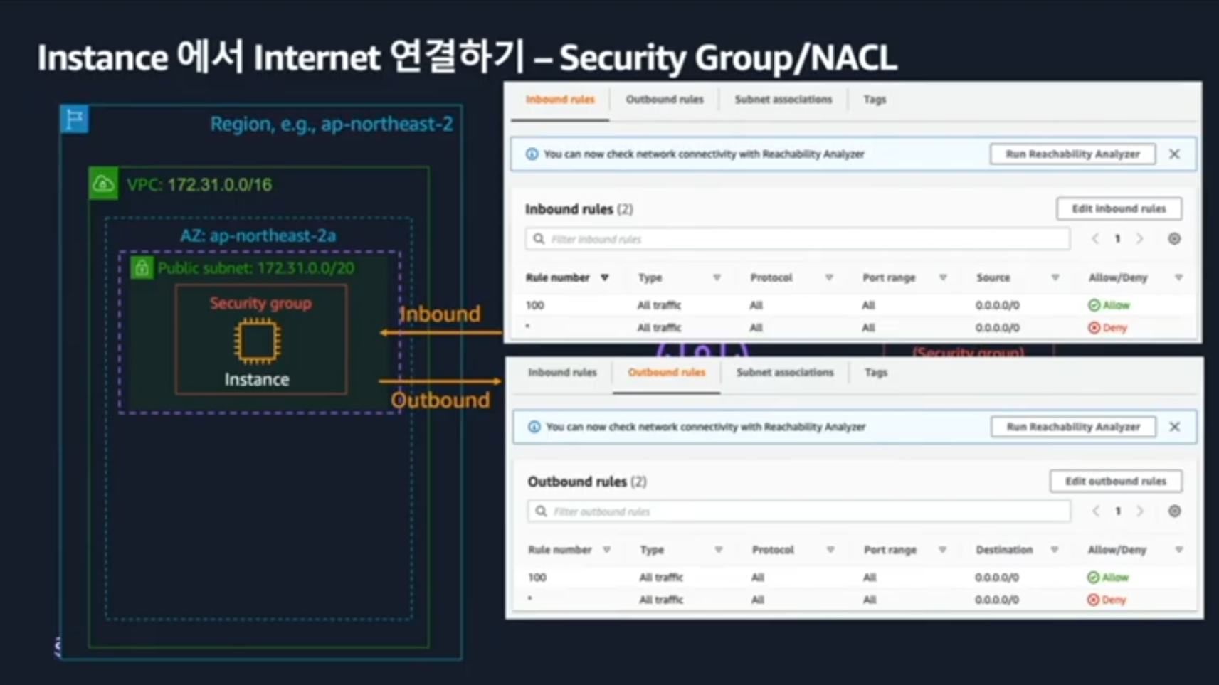 보안 그룹은 허용포트와 IP로 세팅해서 들어올수 있는 인입점을 관리하는것이고 NACL은 아예 Deny와 Allow를 나누어 구동하기 때문에, 필자의 운영 환경의 경우는 대부분 보안그룹으로 구성해서 네트워크를 컨트롤 하고 있다.