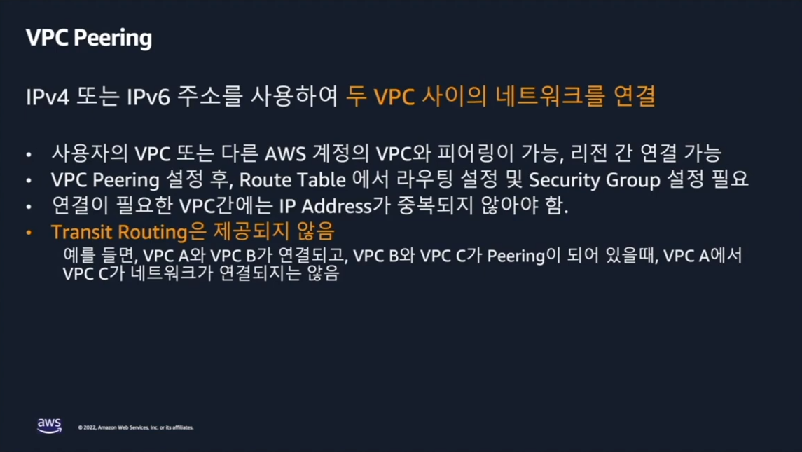 전달 할 수 없다. VPC B에서 VPC A로 패킷을 전달하고 다시 VPC A가 VPC D로 패킷을 전달하는 Transit Routing은 지원하지 않는다.
