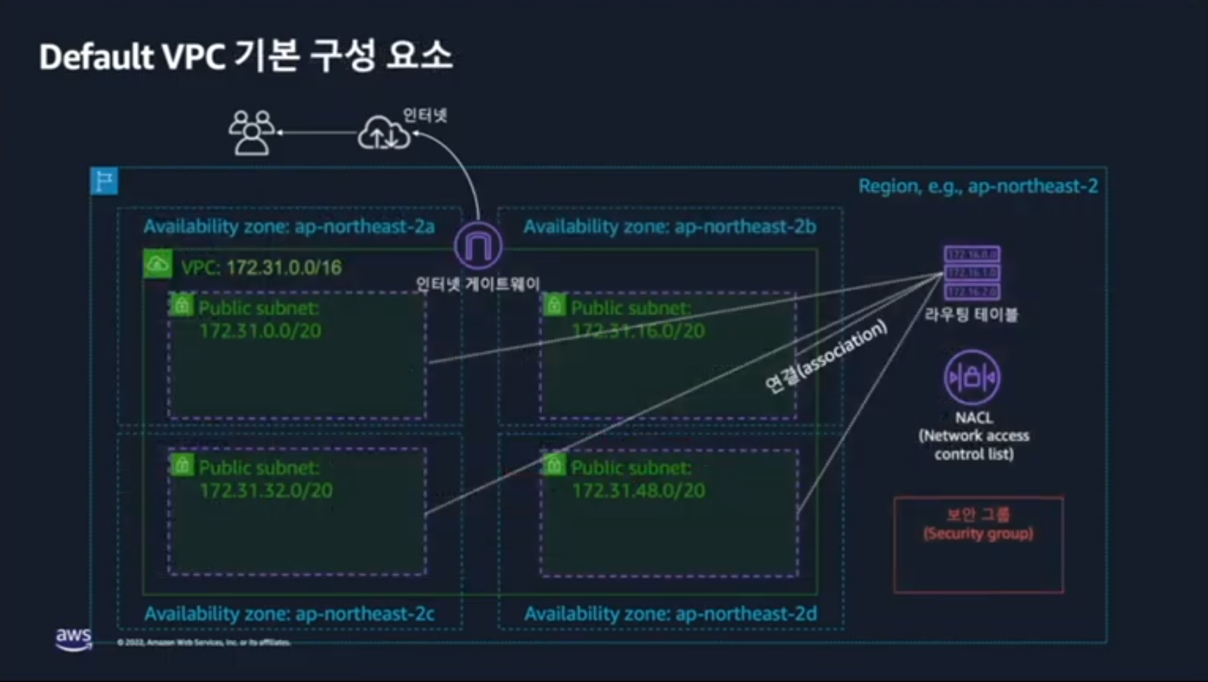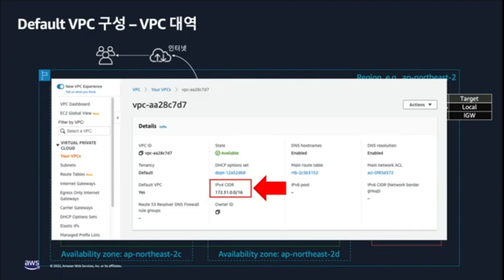 위는 Default VPC의 구성 요소인데 이 Defualt VPC와 Internet은 어떻게 연결되는지를 살펴보자.