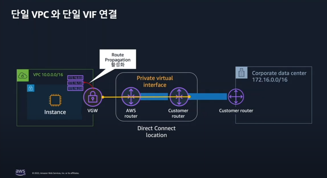 DX를 이용하여 온프레미스와 연결하는 간단한 방법은 DX의 단일 Virtual Interface와 단일 VPC 구성이다.