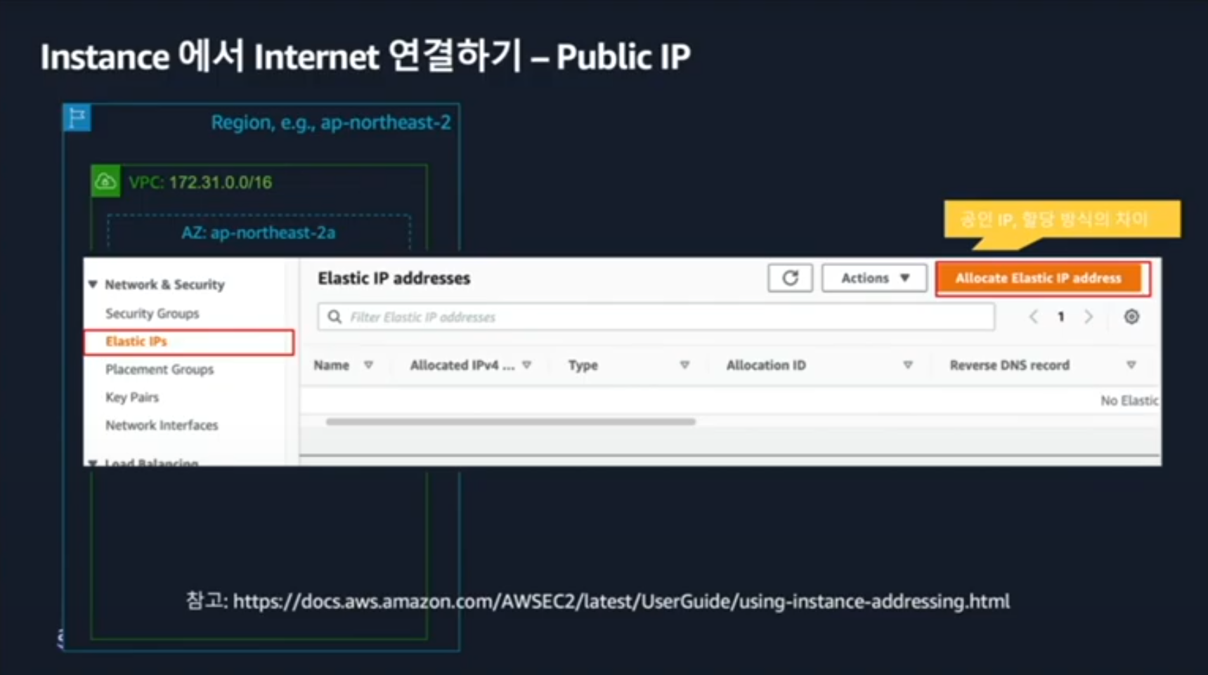 Public IP가 할당되어 있더라도 전원을 껐다가 키면 IP가 바뀌기 때문에, Elastic IP 즉 고정 IP를 할당한다.