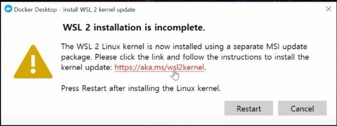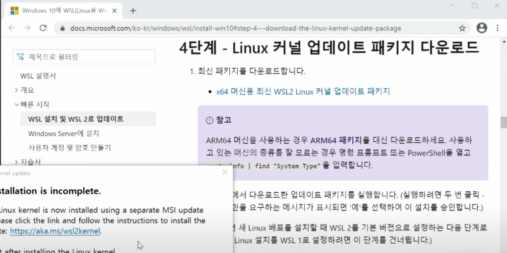컴퓨터를 재부팅 하면 이런 화면이 뜬다. WSL2 커널을 업데이트를 해야 한다.