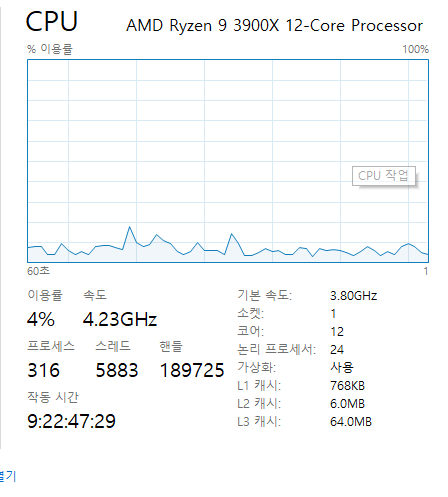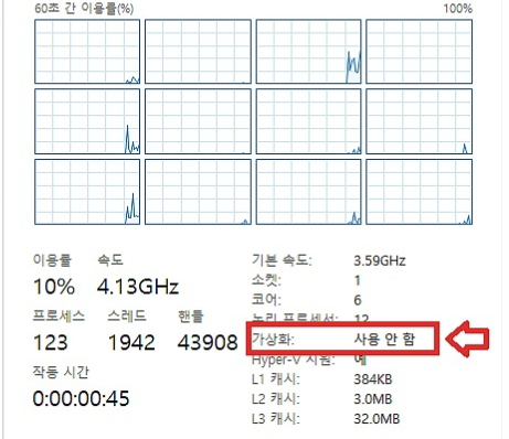작업관리자를 켠 후 성능을 확인해 보면 현재는 가상화를 켜 놨기 떄문에 가상화가 사용안함으로 되어있다.