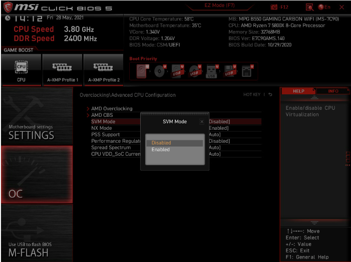 현재 시스템은 MSI 메인보드를 사용하므로 MSI BIOS로 들어간 후 가상화를 설정해 주었다.