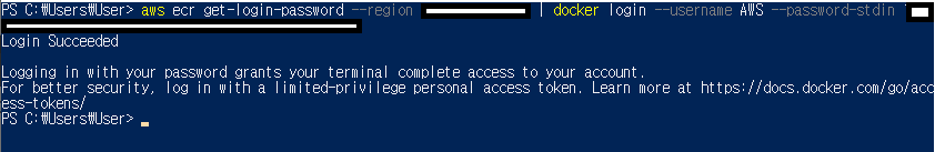 aws ecr get-login-password --region (자신의 계정이 존재하는 리전) | docker login --username AWS --password-stdin (내 aws account id).dkr.ecr.(내 계정이 존재하는 리전).amazonaws.com
