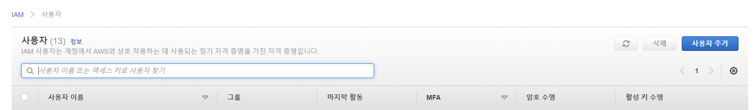 AWS CLI 명령어를 사용할 예정이므로 액세스 키가 활성화 된 IAM 유저가 필요하다. 그러므로 사용자를 추가해야 한다.