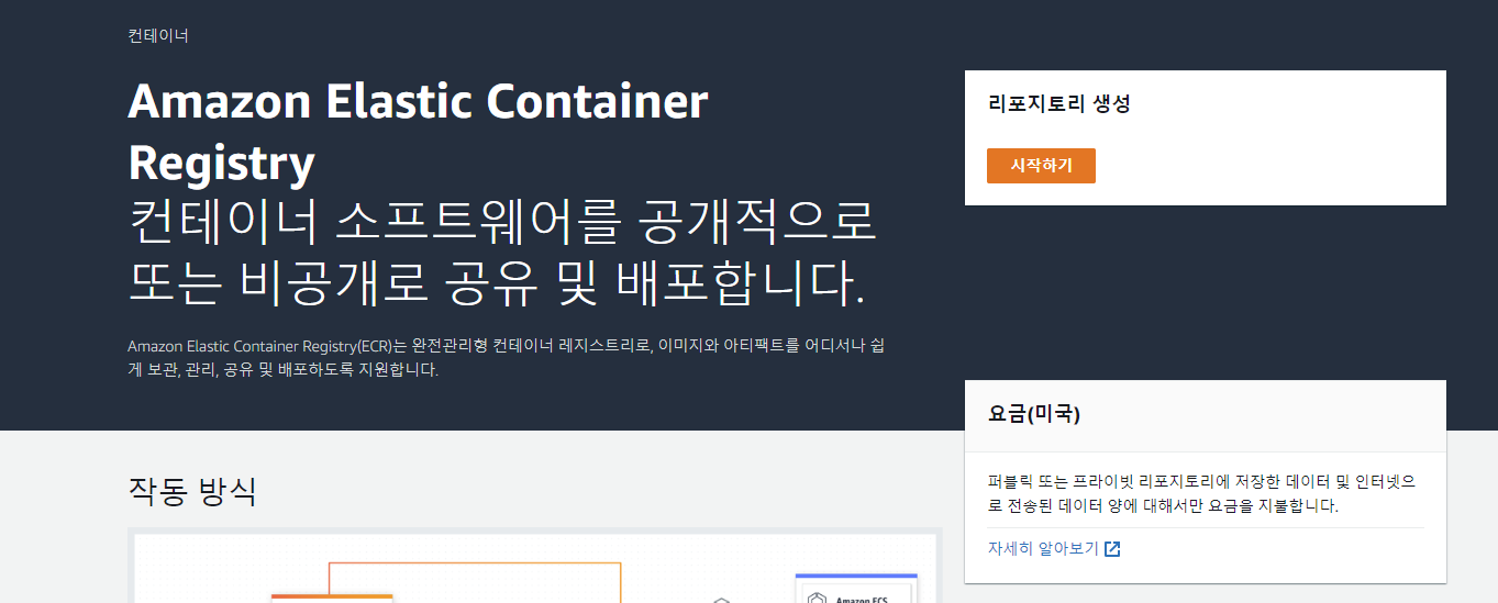 먼저 ECR 리포지토리를 생성할 것이다. 그러므로 ECR 페이지로 들어온 후 리포지토리 생성 시작하기를 클릭한다.