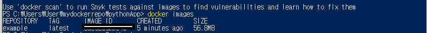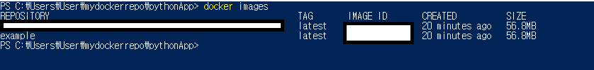 푸쉬까지 마친 이후 docker images를 쳐보면 아까 생성했던 example과 함께 내 ecr 레포지토리가 뜨게 된다.