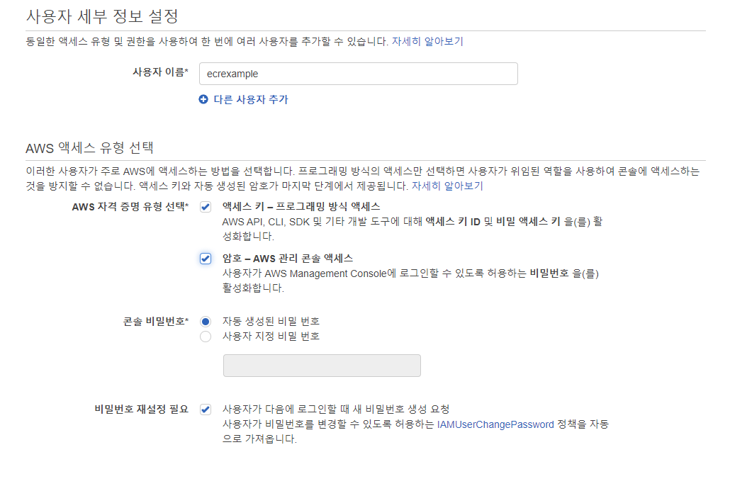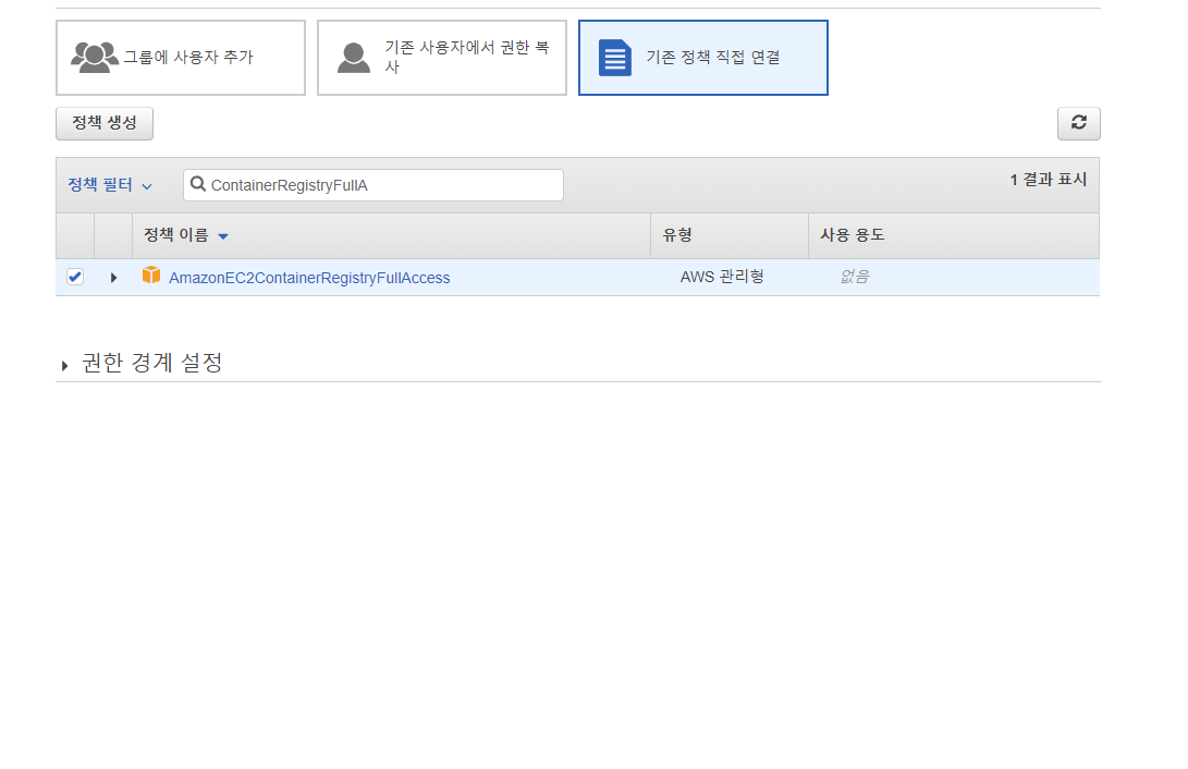 그 후 AmazonEC2ContainerRegistryFullAccess 정책을 연결한 후 IAM 사용자를 만들어 준다.