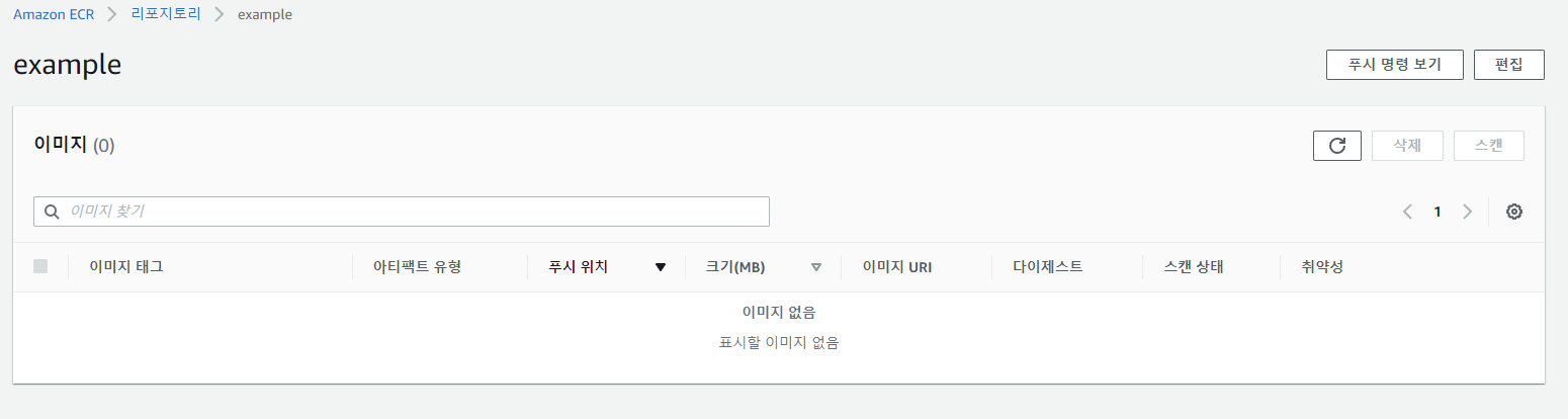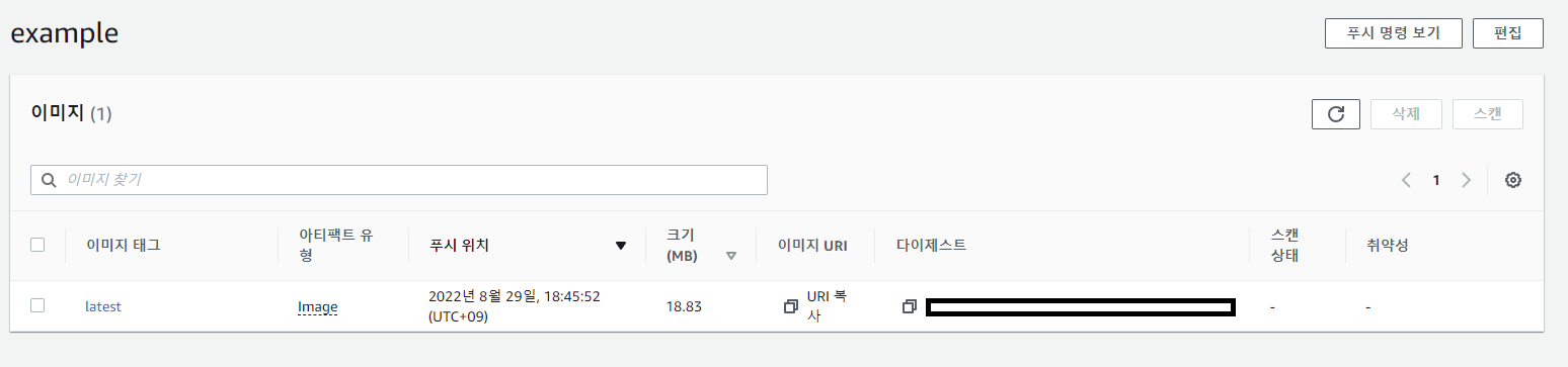 마지막으로 아마존 콘솔로 돌아온 후 내가 생성했던 example 레포지토리를 확인해보면 이미지 태그에 latest라고 달려있는 이미지가 생성된 것을 볼 수 있다.