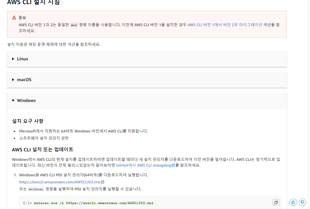 최신 버전의 AWS CLI 설치 또는 업데이트 - AWS Command Line Interface (amazon.com)