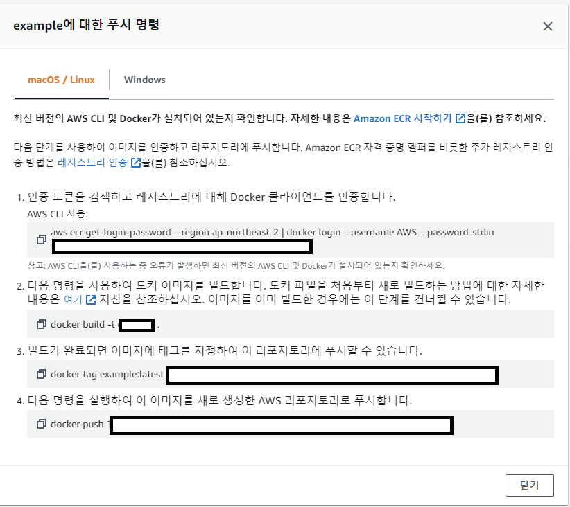 우리가 생성한 ECR 리포지토리를 클릭하면 푸시 명령 보기라는 부분이 있다. 그 부분을 클릭하면 Docker 클라이언트 인증부터 도커 이미지 빌드 및 푸시에 관한 명령어들이 나온다.