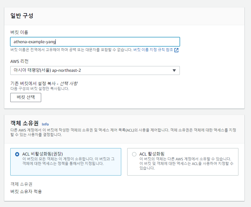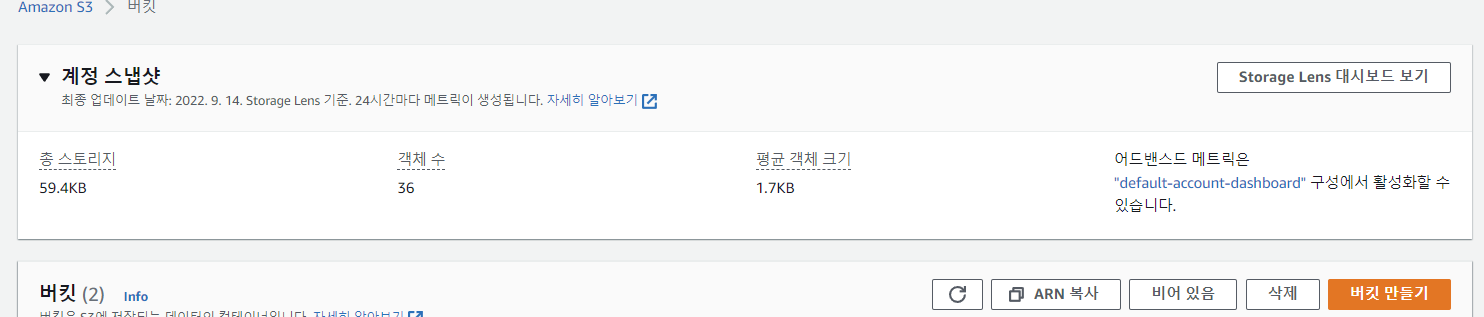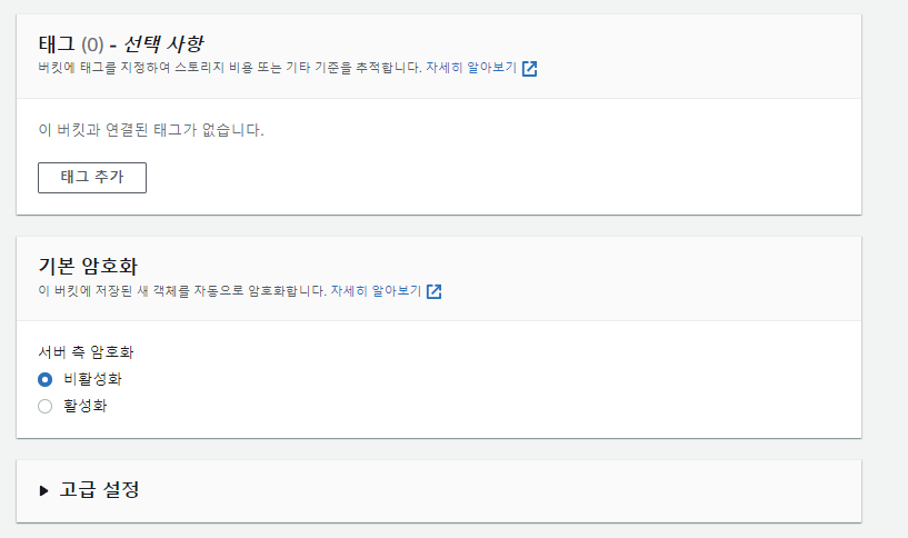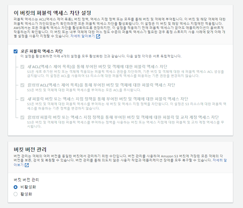 이름을 설정한 후 나머지는 기본값으로 세팅한 후 버킷을 만들어 준다.