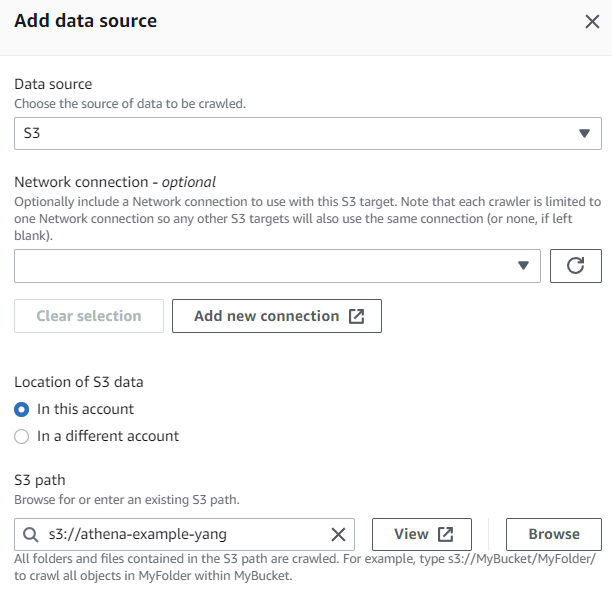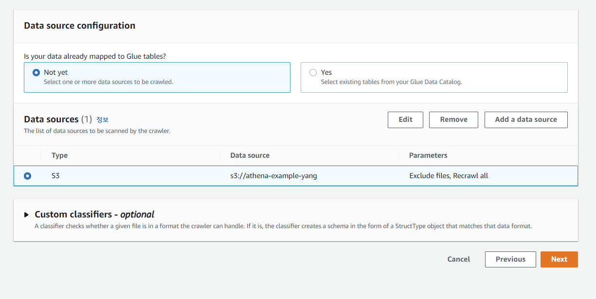 그 후 Data source를 S3로 지정해 주고 위에서 만든 athena-example-yang 버킷을 선택 해 준다.