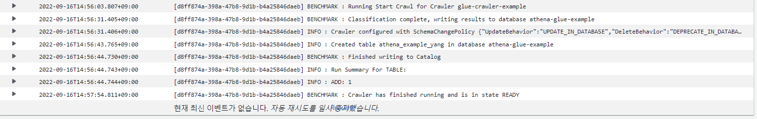 그 후 Cloudwatch 로그 그룹을 통해서 크롤러가 어떻게 돌아갔는지 로그를 확인할 수 있다.
