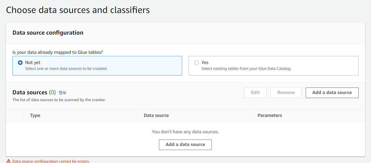 현재 우리는 데이터가 Glue Table에 매핑되어 있지 않으므로 Not yet을 선택한다.