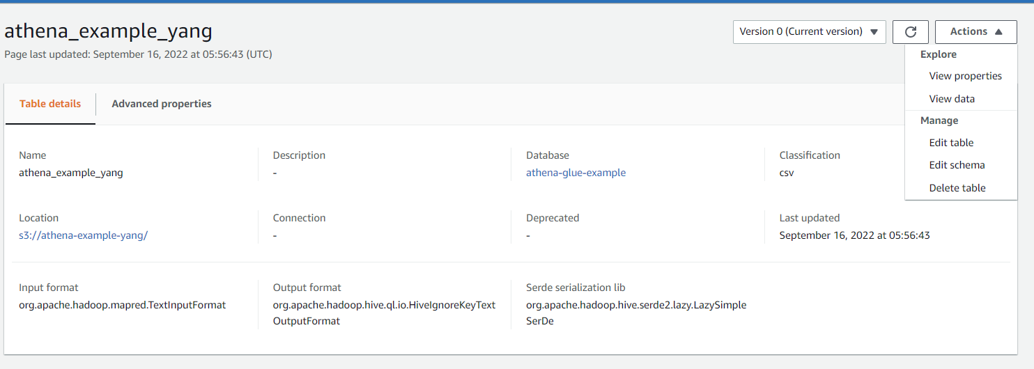 그 후 다시 Glue로 돌아와서 Tables를 확인 해 보니 하나 생성 된 것을 확인할 수 있었다.