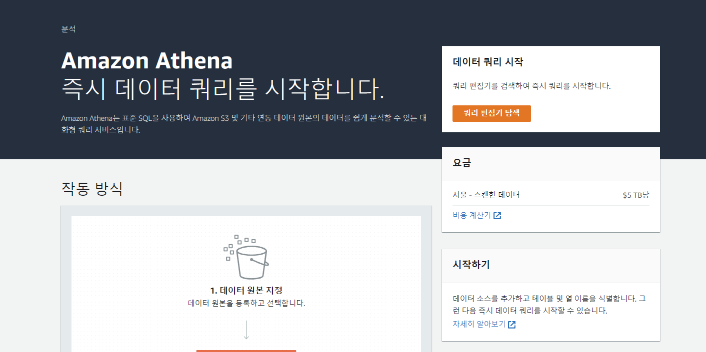 그 다음 Athena에 들어온 후 쿼리 편집기 탐색을 클릭한다.