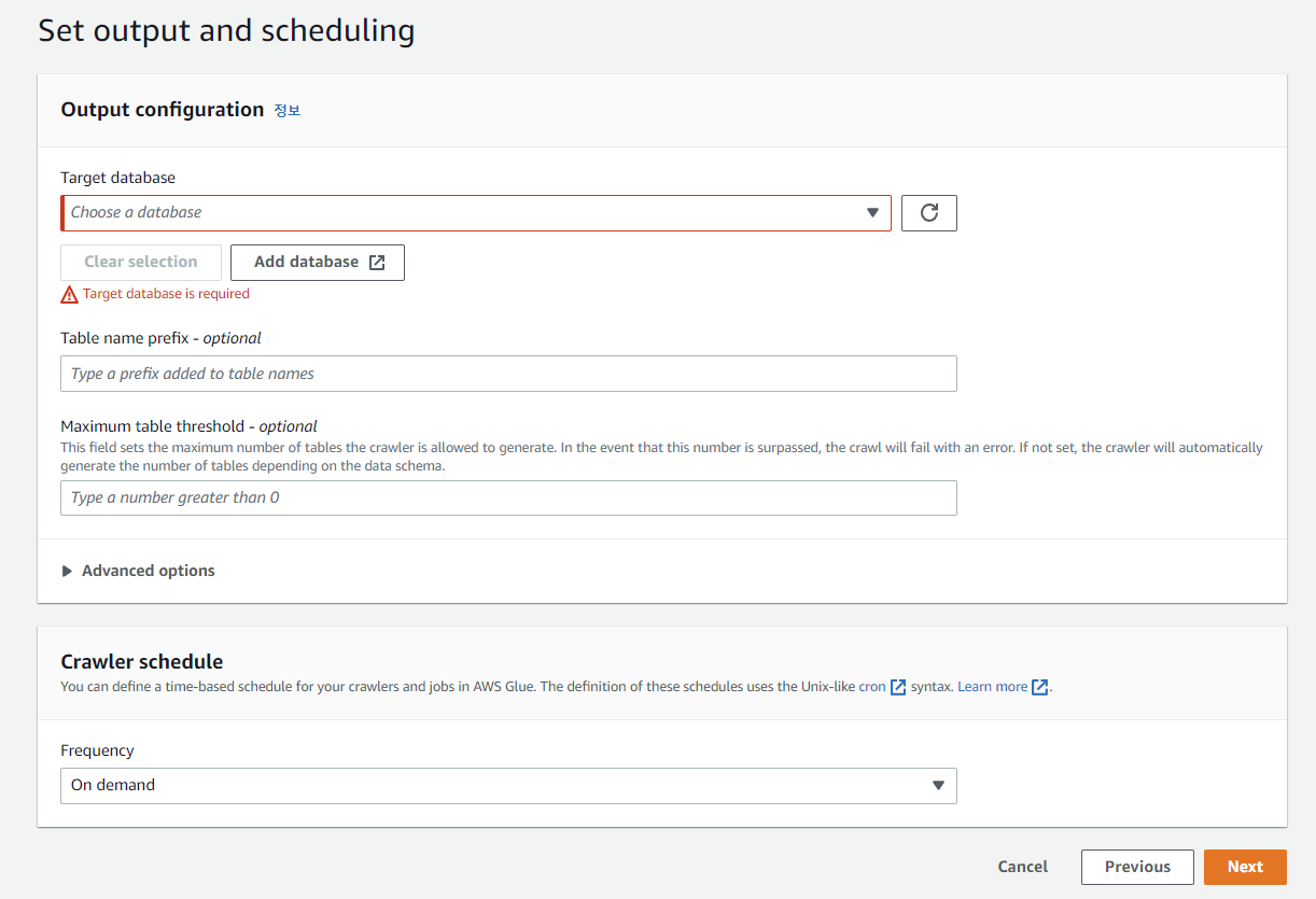 Crawler schedule은 On demand로 해 주고 방금 만든 Target database를 선택해 준다.