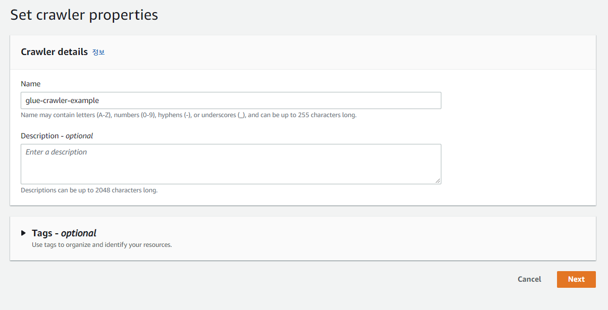 먼저 크롤러 이름을 설정한 후에 Next를 눌러준다.