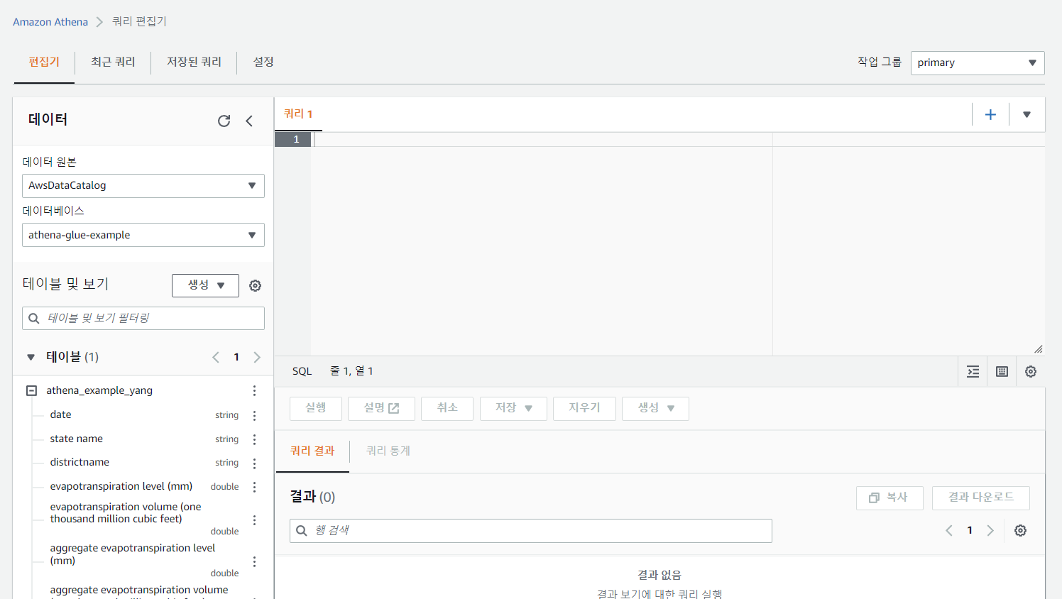 왼쪽을 보면 데이터 원본 및 데이터베이스가 우리가 위에서 Glue에서 진행했던 내용을 확인할 수 있따.