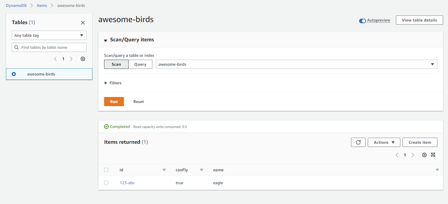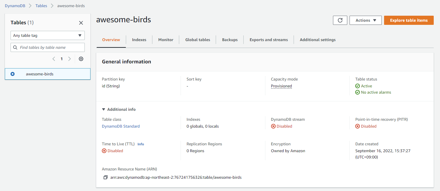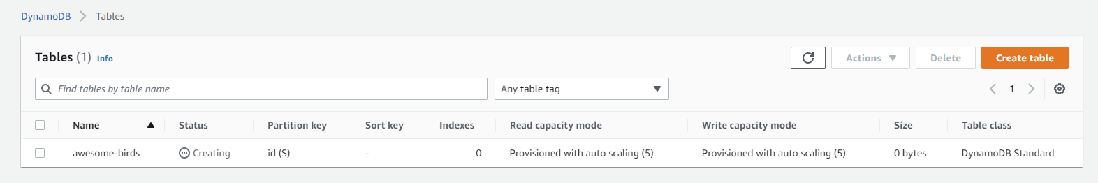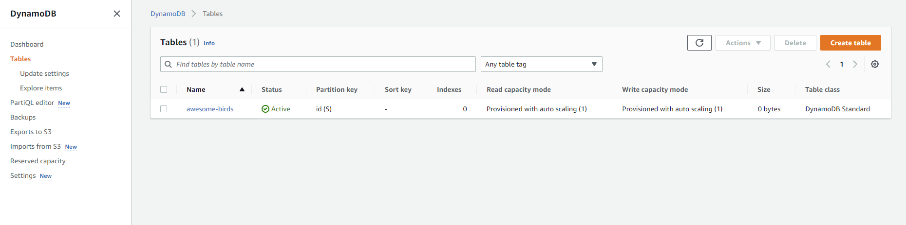 해당 실습은 새에 대한 데이터를 적재하는 실습이라 테이블 이름은 awesome-birds로 지정했지만, 원하는 테이블 이름으로 생성하면 된다.