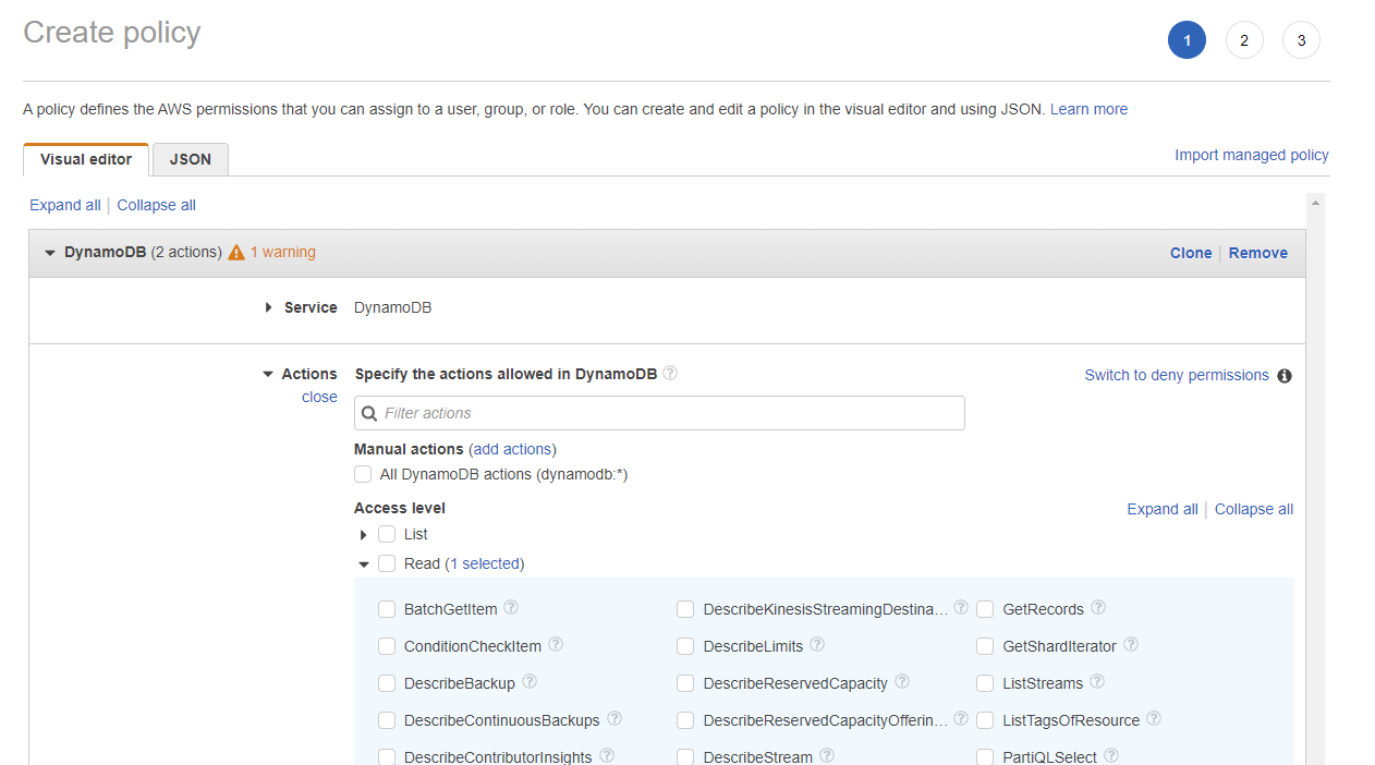 정책에서 Dynamo DB Table로 접속하고 읽을수 있도록 추가한다.