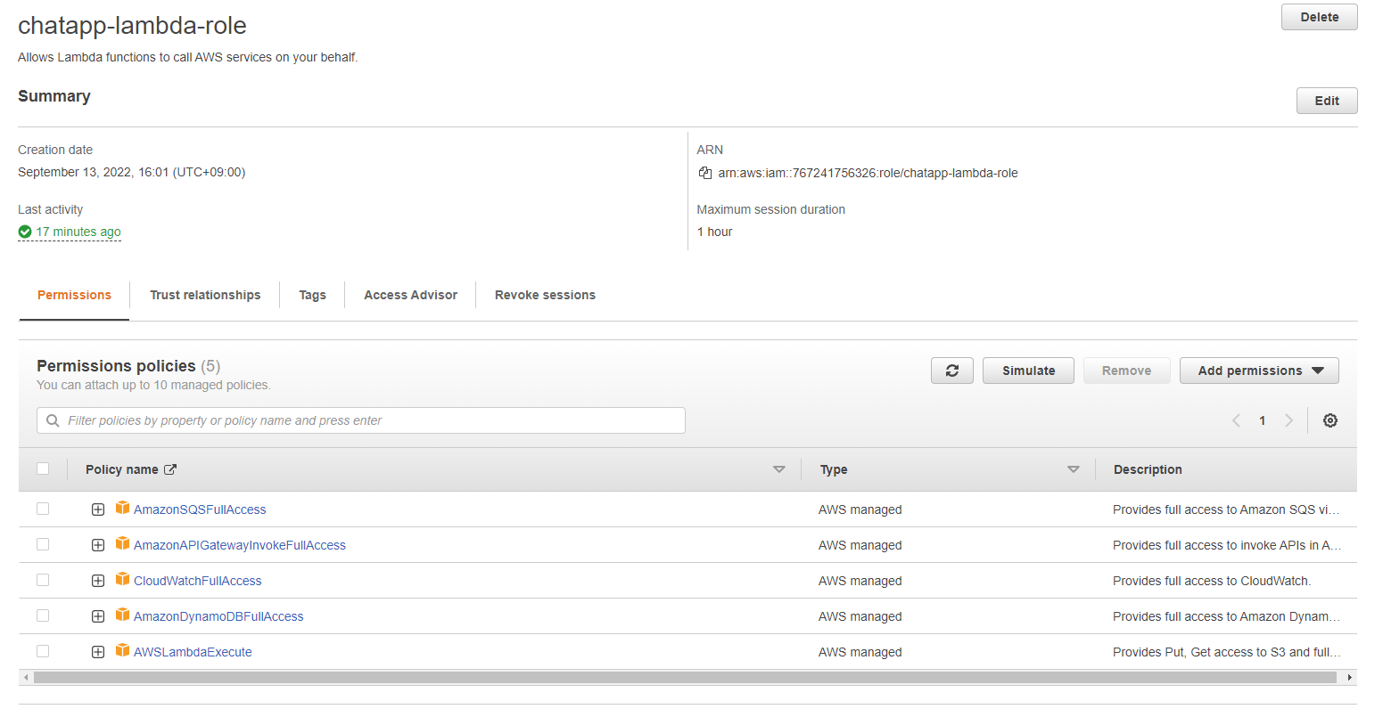 IAM Role에는 DynamoDB Full Access, SQS Full Access, API Gateway invoke 등 이전에 실습했던 Role인데 필요한 Role이 거의 모두 추가 되어 있어 해당 Role을 재활용 하려고 한다.