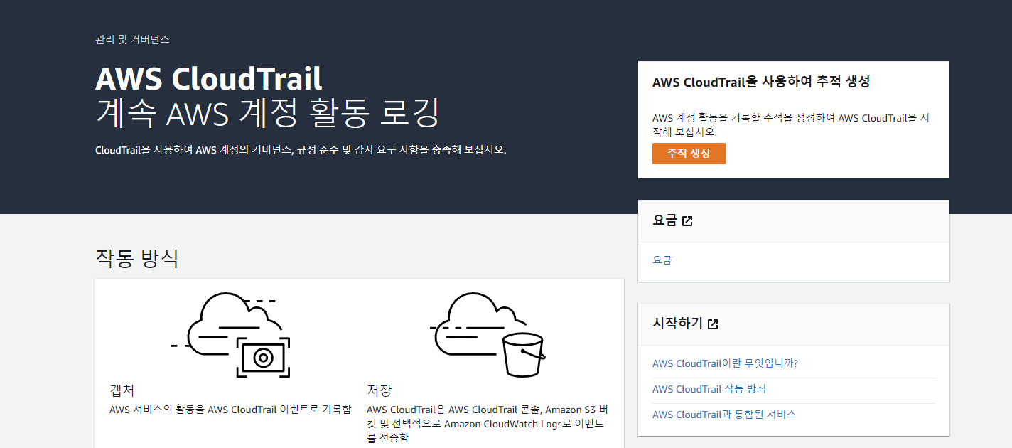 AWS CloudTrail은 AWS 계정의 운영 및 위험 감사, 거버넌스 및 규정 준수를 활성화하는 데 도움이 되는 AWS 서비스입니다. 사용자, 역할 또는 AWS 서비스가 수행하는 작업은 CloudTrail에 이벤트로 기록됩니다. 이벤트에는 AWS Management Console, AWS Command Line Interface 및 AWS SDK, API에서 수행되는 작업들이 포함됩니다.