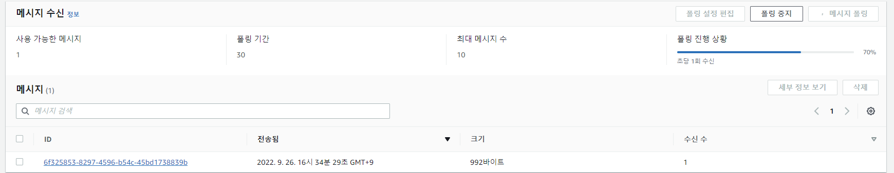 SQS로 들어간 후 메세지 수신을 보니 사용 가능한 메시지가 1개 있는 것을 확인할 수 있었다. 이를폴링해 보니 메세지가 하나 생성 되었다.