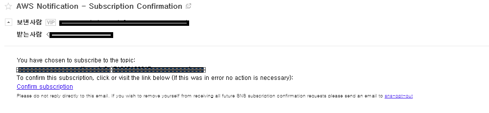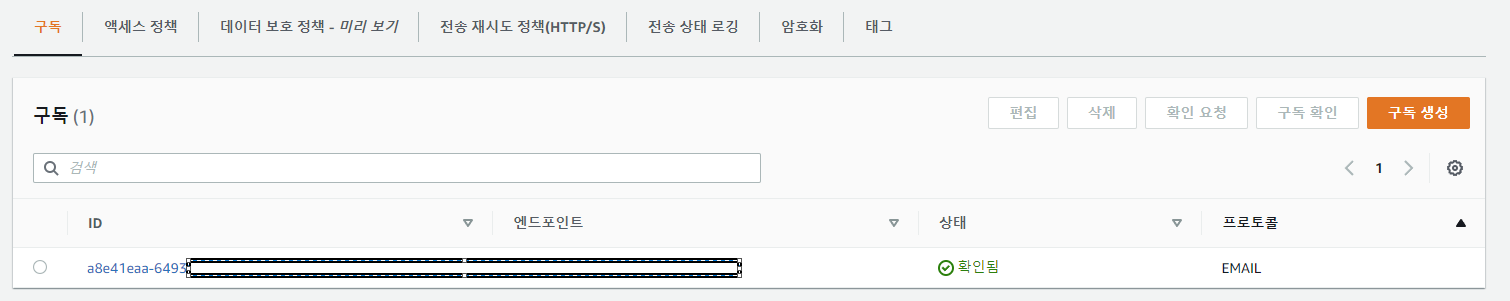 이메일로 지정한 후 엔드포인트를 내 Email로 작성한 후 나머지는 기본값으로 유지한 후 구독 생성을 클릭한다.