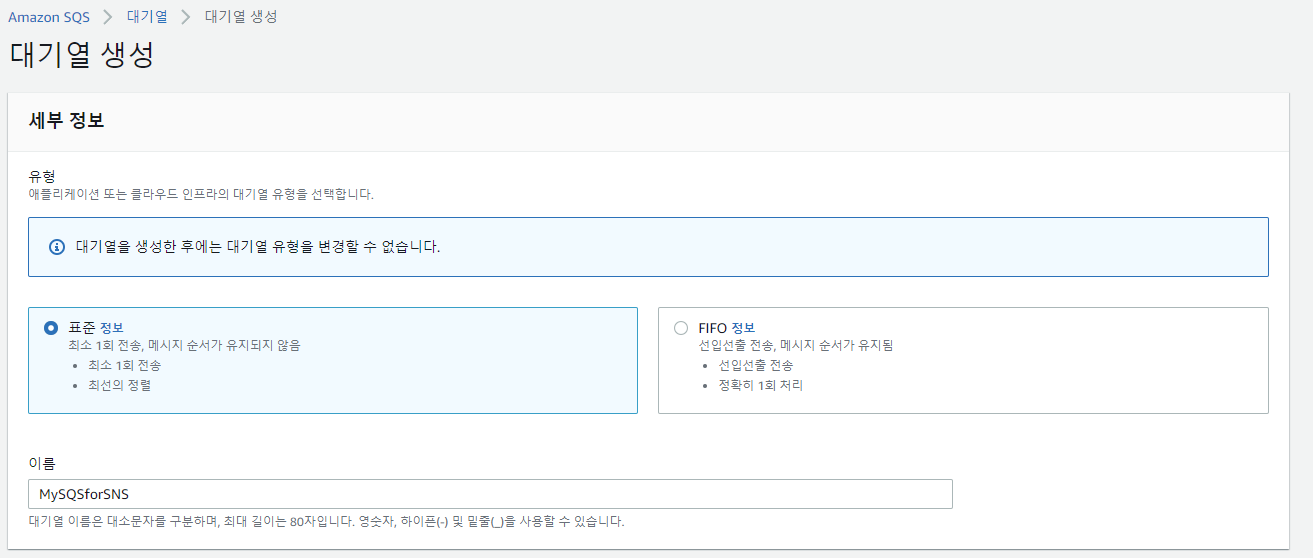 먼저 대기열 생성을 통해서 SQS를 생성 해 준다.