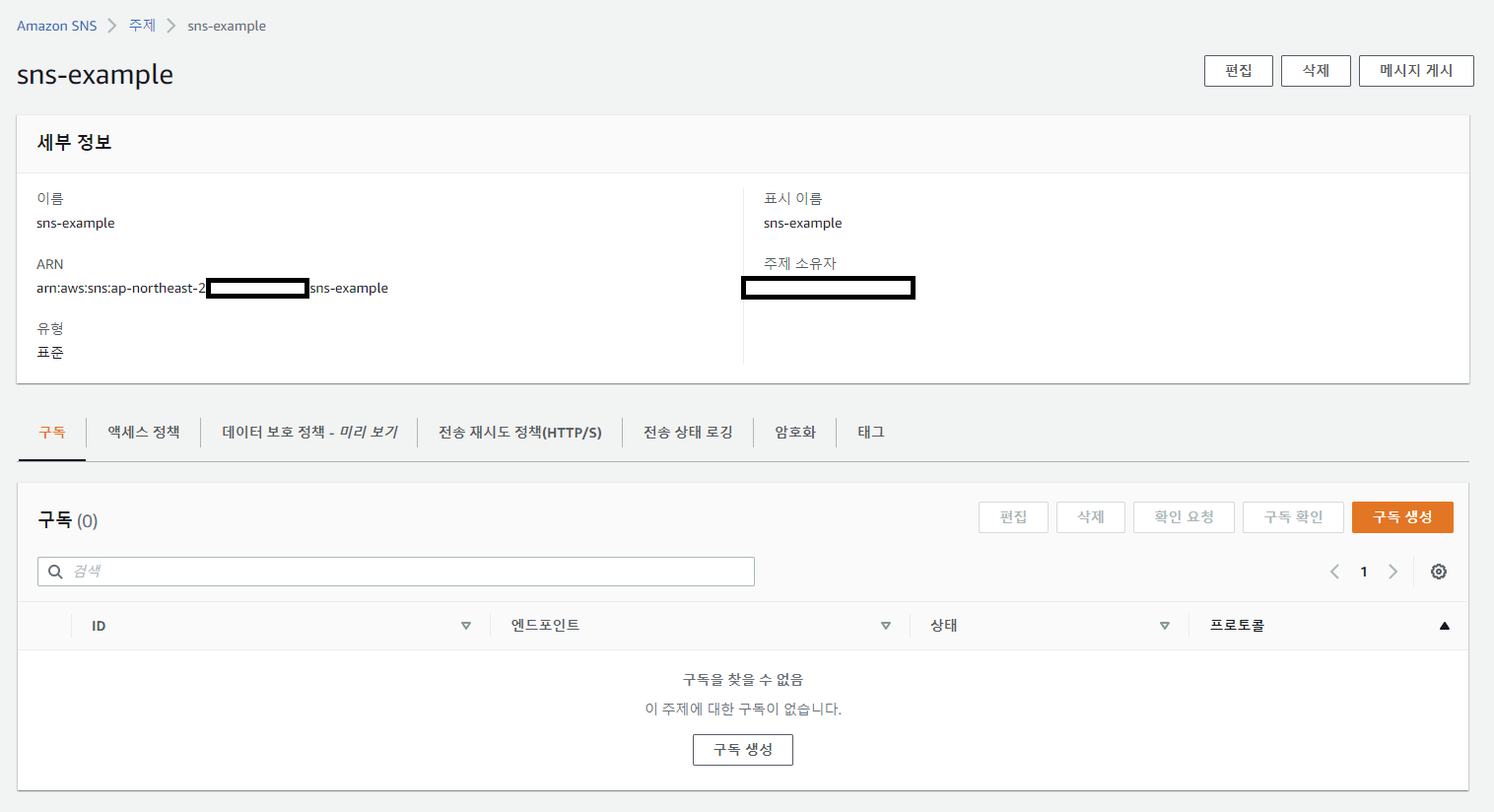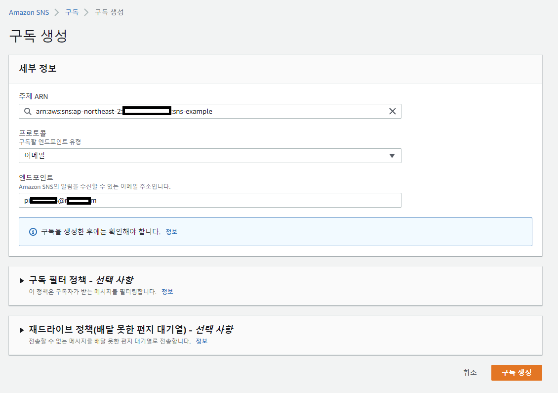 구독 생성을 클릭하면 주제 ARN을 방금 생성한 SNS로 자동으로 잡아준다.