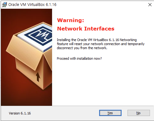이 화면은 네트워크 인터페이스를 가상 네트워크 구현을 위해서 리셋한다는 의미로 Yes를 클릭 해야 진행이 가능하다.